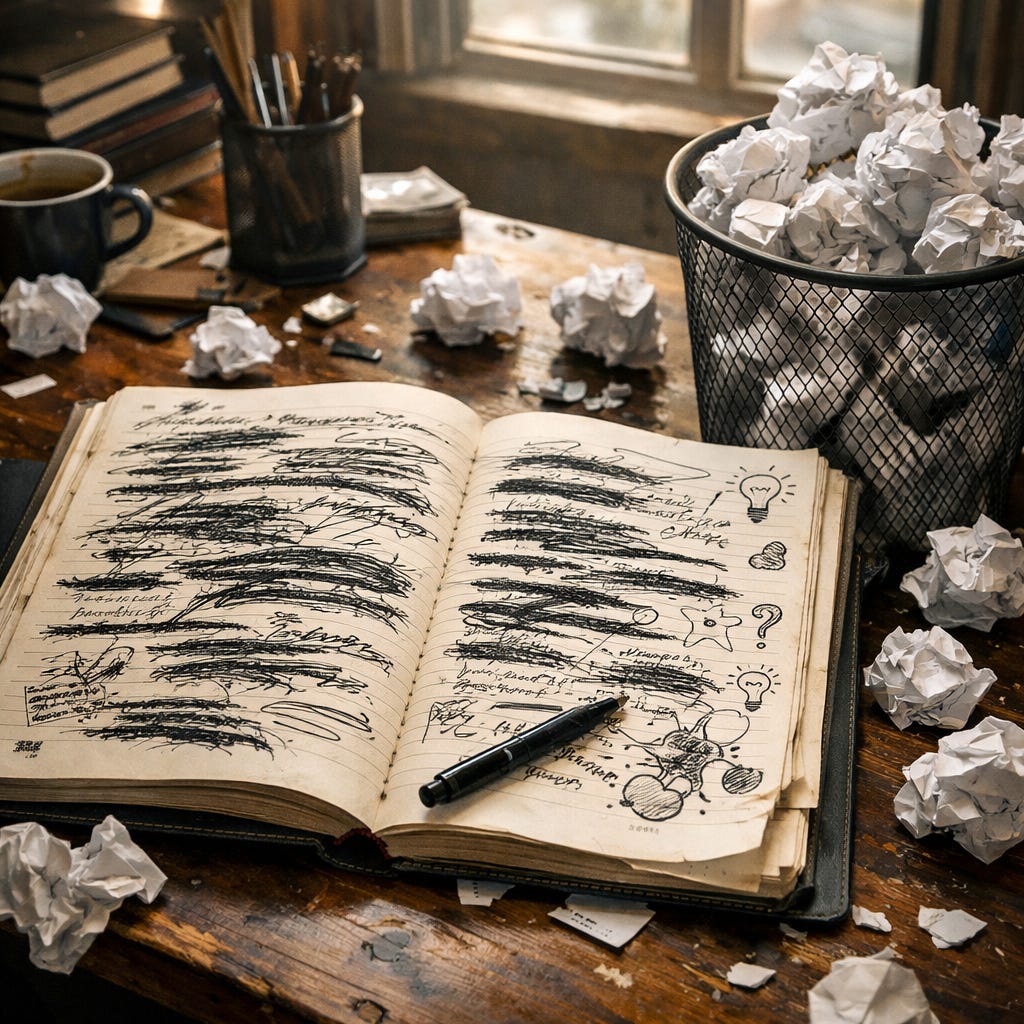 It’s time to get started. A title? I fill it in... but I’m not convinced. I cross it out, I scribble.